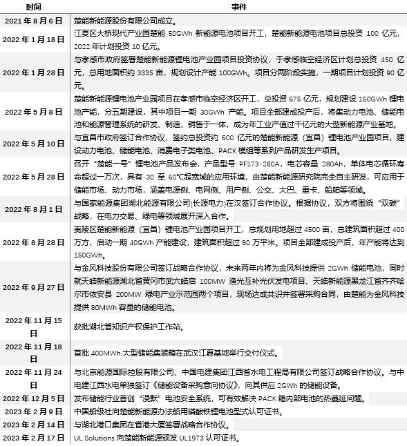 中國粉體網(wǎng)訊 2021年8月6日,湖北恒信汽車集團(tuán)宣布,全資40億注冊楚能新能源股份有限公司,正式進(jìn)軍新能源領(lǐng)域,競逐鋰電賽道。短短兩年間,楚能新能源從無到有,截至日前,投資已達(dá)1375億元,規(guī)劃鋰電池產(chǎn)能達(dá)到350GWh,完成了在湖北的一次性規(guī)劃產(chǎn)業(yè)布局,分別在武漢江夏、孝感、宜昌設(shè)立三大基地,梯次開工、投產(chǎn)。