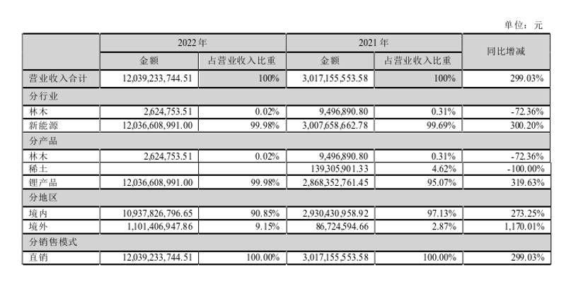 報告期內(nèi),盛新鋰能營業(yè)收入120.39億元,同比增長299.03%;實(shí)現(xiàn)歸屬于上市公司股東的凈利潤55.52億元,同比增長541.32%。其中鋰產(chǎn)品收入約為120.37億元(占營業(yè)收入比重高達(dá)99.98%),同比增長319.63%。