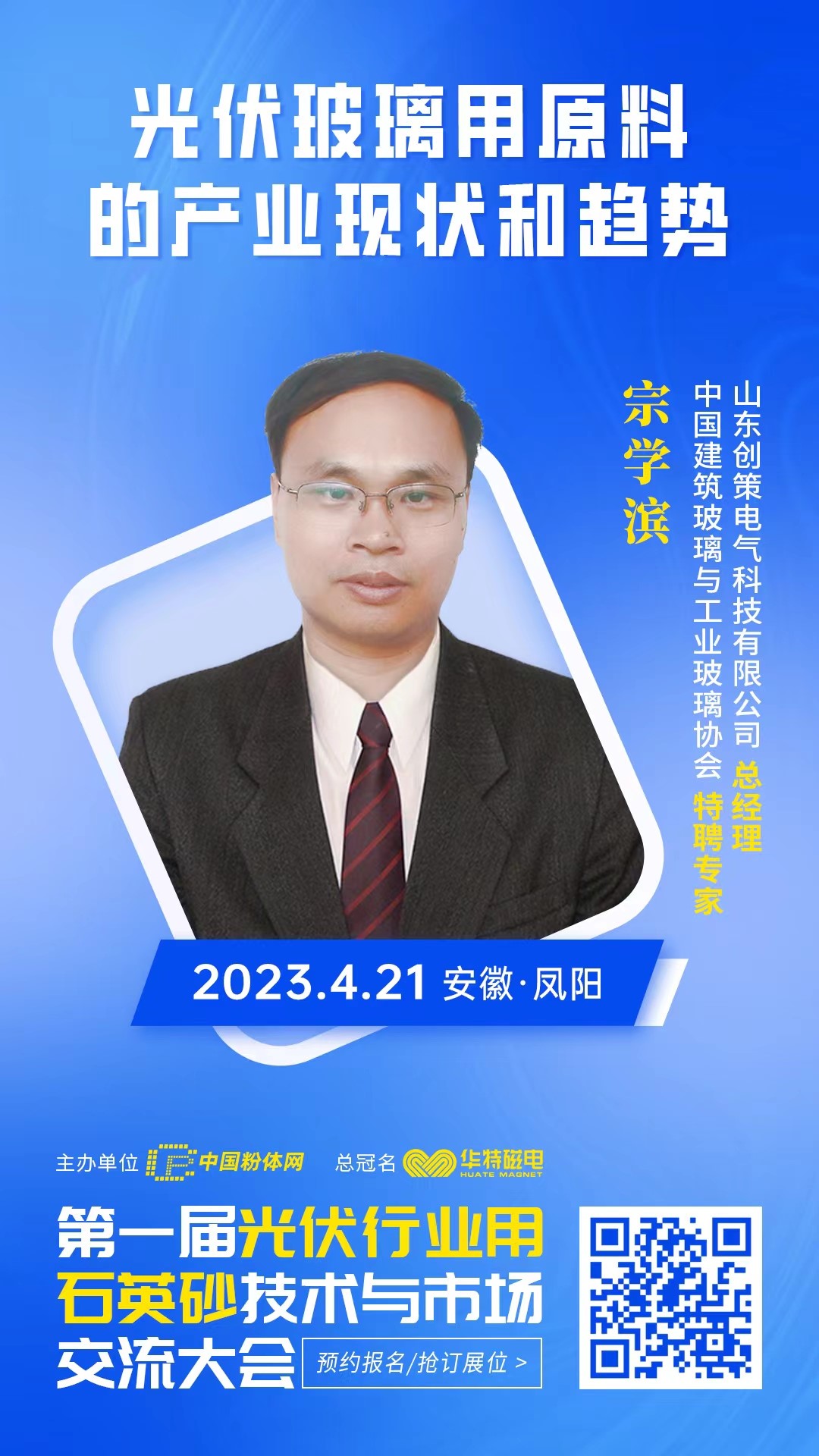 2023年4月21日,中國粉體網(wǎng)將在安徽鳳陽舉辦“第一屆光伏行業(yè)用石英砂技術(shù)與市場交流大會”。山東創(chuàng)策電氣科技有限公司總經(jīng)理&中國建筑玻璃與工業(yè)玻璃協(xié)會特聘專家宗學(xué)濱將帶來題為《光伏玻璃用原料的產(chǎn)業(yè)現(xiàn)狀和趨勢》的報告。