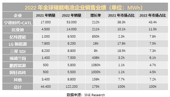 根據(jù)發(fā)布數(shù)據(jù)顯示,2022年,寧德時(shí)代、比亞迪、億緯鋰能分別鎖定全球儲能電池市場的前三席,寧德時(shí)代更是以43.4%的市場占有率穩(wěn)居榜首。此外,儲能電池銷量超過5GWh的中國電池企業(yè)還有瑞浦蘭鈞、鵬輝能源、國軒高科,中國電池企業(yè)儲能電池銷量更是超過全球市場的78%。