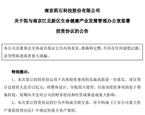 中國(guó)粉體網(wǎng)訊 3月14日,藥石科技發(fā)布公告,為進(jìn)一步提升公司創(chuàng)新藥研發(fā)一體化服務(wù)能力,充分利用南京生物醫(yī)藥谷的區(qū)位優(yōu)勢(shì)、產(chǎn)業(yè)優(yōu)勢(shì)、人才優(yōu)勢(shì),公司擬與南京江北新區(qū)生命健康產(chǎn)業(yè)發(fā)展管理辦公室(“生命健康辦”)簽署《投資協(xié)議》(“投資協(xié)議”),投資人民幣12億元在南京江北新區(qū)生物醫(yī)藥谷建設(shè)創(chuàng)新藥物工藝開(kāi)發(fā)及中試平臺(tái)項(xiàng)目(“項(xiàng)目”)。