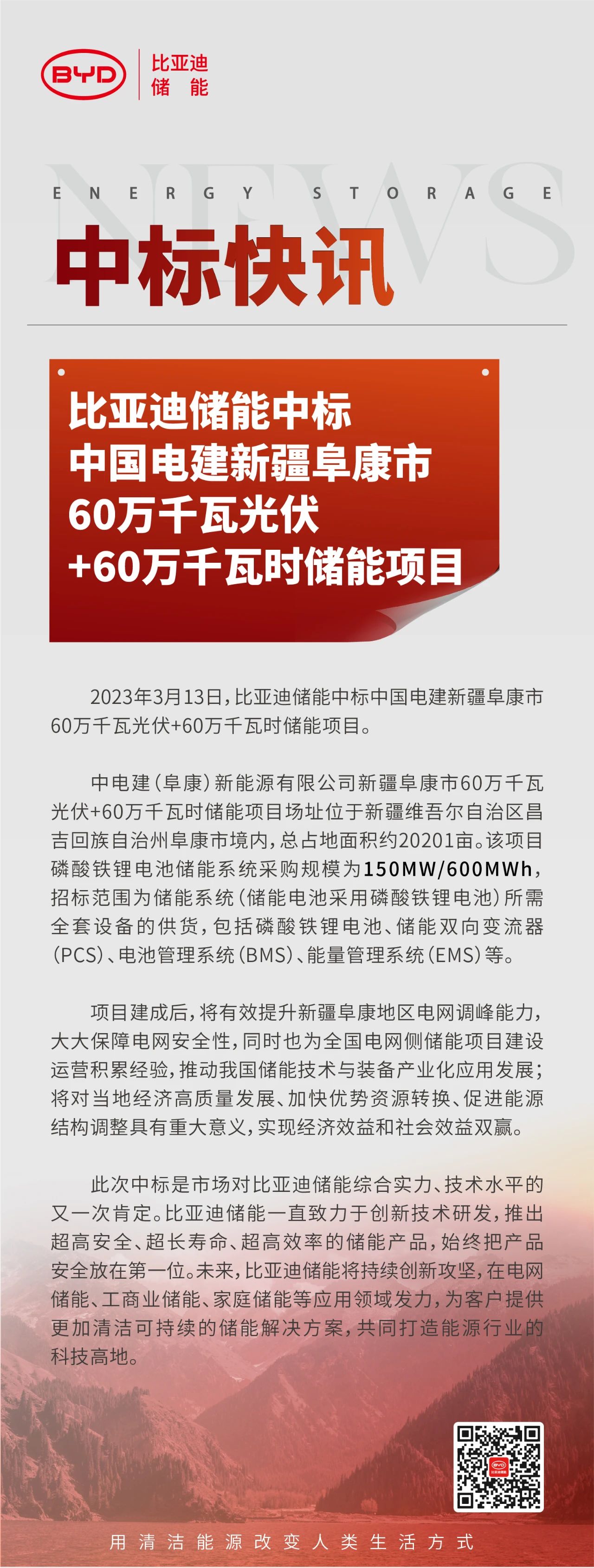 中國粉體網(wǎng)訊 3月13日,比亞迪儲能中標中國電建新疆阜康市60萬千瓦光伏+60萬千瓦時儲能項目。