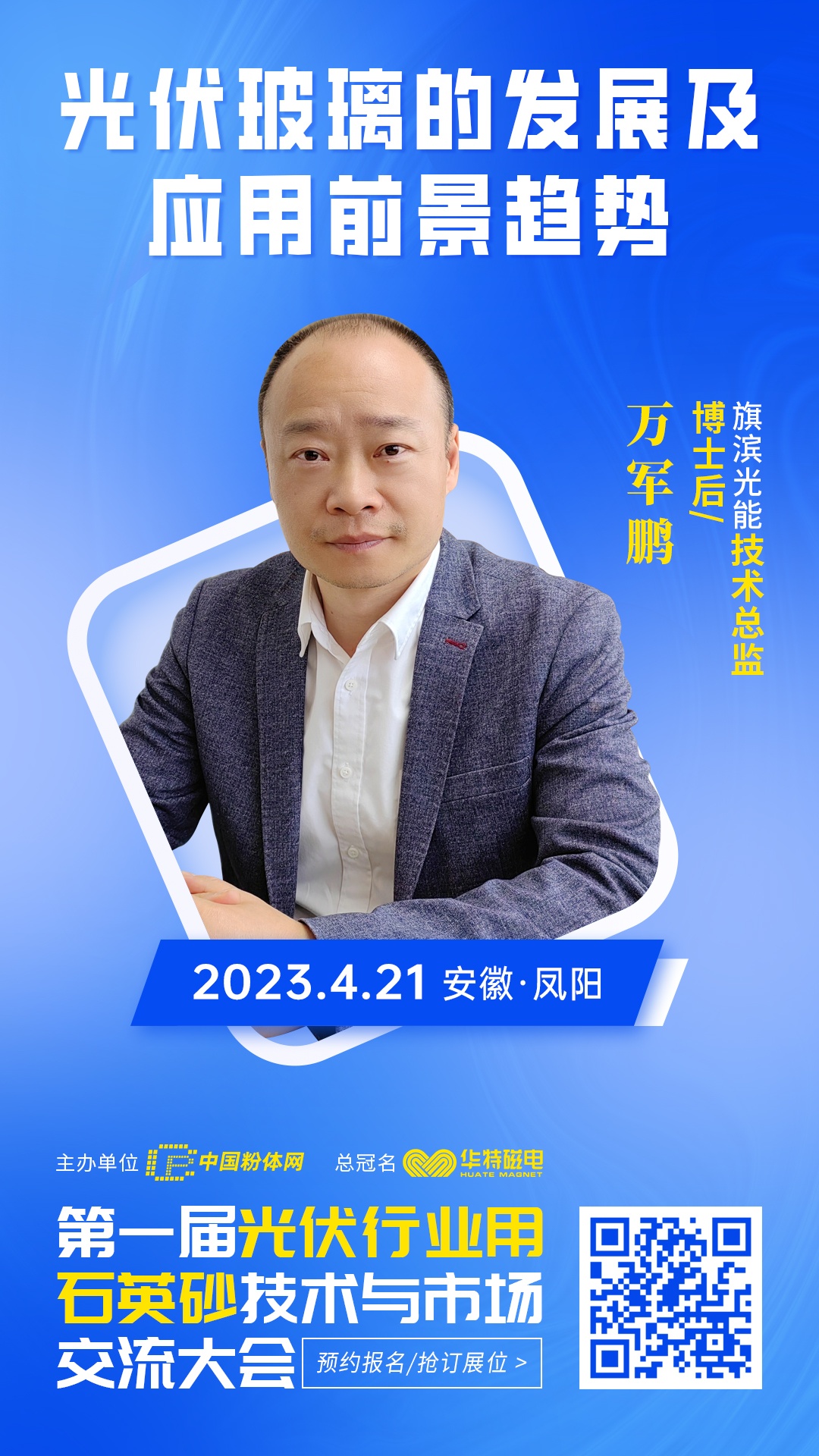 2023年4月21日,中國粉體網(wǎng)將在安徽鳳陽舉辦“第一屆光伏行業(yè)用石英砂技術(shù)與市場交流大會”。旗濱光能的技術(shù)總監(jiān)萬軍鵬將帶來題為《光伏玻璃的發(fā)展及應(yīng)用前景趨勢》的報告,屆時,他會對光伏玻璃行業(yè)的發(fā)展情況進(jìn)行全面系統(tǒng)的分析。