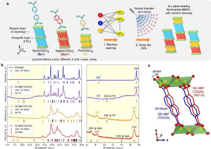 圖1.材料選擇、合成和結(jié)構(gòu)表征。a創(chuàng)建多元iMOF材料的概念示意圖。b粉末XRD圖。c晶體結(jié)構(gòu)差異示意圖。紅色和藍(lán)色骨架是碳骨架。紅色和黃色球體分別代表O和Li。綠色代表四面體LiO4層。