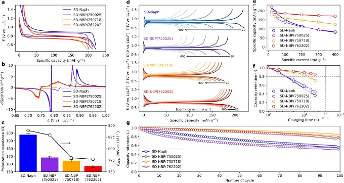 基于芳香族二羧酸鹽的插層金屬有機(jī)骨架(iMOF)可作為有前景的負(fù)極活性材料,用于鋰基電化學(xué)儲(chǔ)能裝置。然而,它們的快速充電能力仍然是一個(gè)巨大的瓶頸。為了避免這個(gè)問題,作者使用機(jī)器學(xué)習(xí)選擇,并通過溶液噴霧干燥法,合成了多芳香單元的iMOF。這種基于萘的多元材料(具有納米厚度)能夠?qū)崿F(xiàn)鋰離子在非水鋰金屬電池中可逆存儲(chǔ)。因此,相比于在20mAg-1下循環(huán)(即充滿電需10h),該材料在400mAg-1和20°C下可達(dá)到85%的容量保持率(即充滿電需30min)。該材料與活性炭基材的正極結(jié)合后,在0.15mAcm-2和20°C下循環(huán)1000次后,實(shí)現(xiàn)了約為91%的放電容量保持率(即充滿電需2h)。作者闡明了電荷存儲(chǔ)機(jī)制,并證明了在Li嵌入過程中,扭曲的晶體結(jié)構(gòu)促進(jìn)了電子離域(通過控制骨架振動(dòng))。因此,相變抑制了相分離,從而有利于電極的快速充電行為。