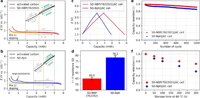 圖3.在非水鋰離子電容器結(jié)構(gòu)中的電化學(xué)測試。a、b具有活性炭(AC)正極的不對(duì)稱電容器的設(shè)計(jì);以及基于SD-NPB(762202)(a)和SD-Bph(b)負(fù)極內(nèi)阻所得的容量利用范圍。c,d初始充放電曲線(c)和I-V電阻(d);在0.15mAcm-2,20°C。e、f不同電池在20°C、1mAcm-2下,循環(huán)1000次后的容量保持率(e);以及不同電池在60°C下儲(chǔ)存后,在20°C、0.15mAcm-2下的容量保持率(f)。