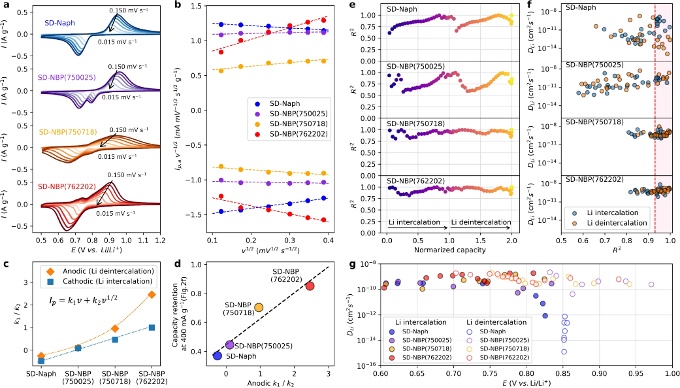 圖4.電化學(xué)分析。aLi||iMOF電池的循環(huán)伏安圖。bLi||iMOF電池的Ipv?1/2vs.v1/2,從0.015mVs-1到0.150mVs-1的關(guān)系圖。c不同樣品的CV曲線中的陽極氧化和陰極還原的k1/k2值。d在400mAg-1特定電流下的容量保持率與陽極k1/k2的關(guān)系。e在不同樣品的Li嵌入(0.0–1.0)和脫嵌(1.0–2.0)期間,電位變化與時(shí)間根(t1/2)的線性擬合(R2)與標(biāo)準(zhǔn)化容量的關(guān)系。f通過GITT獲得的DLi與R2的關(guān)系圖。粉紅色區(qū)域被視為DLi的固溶體反應(yīng)機(jī)制區(qū)域。gDLi與電勢的關(guān)系圖的比較。