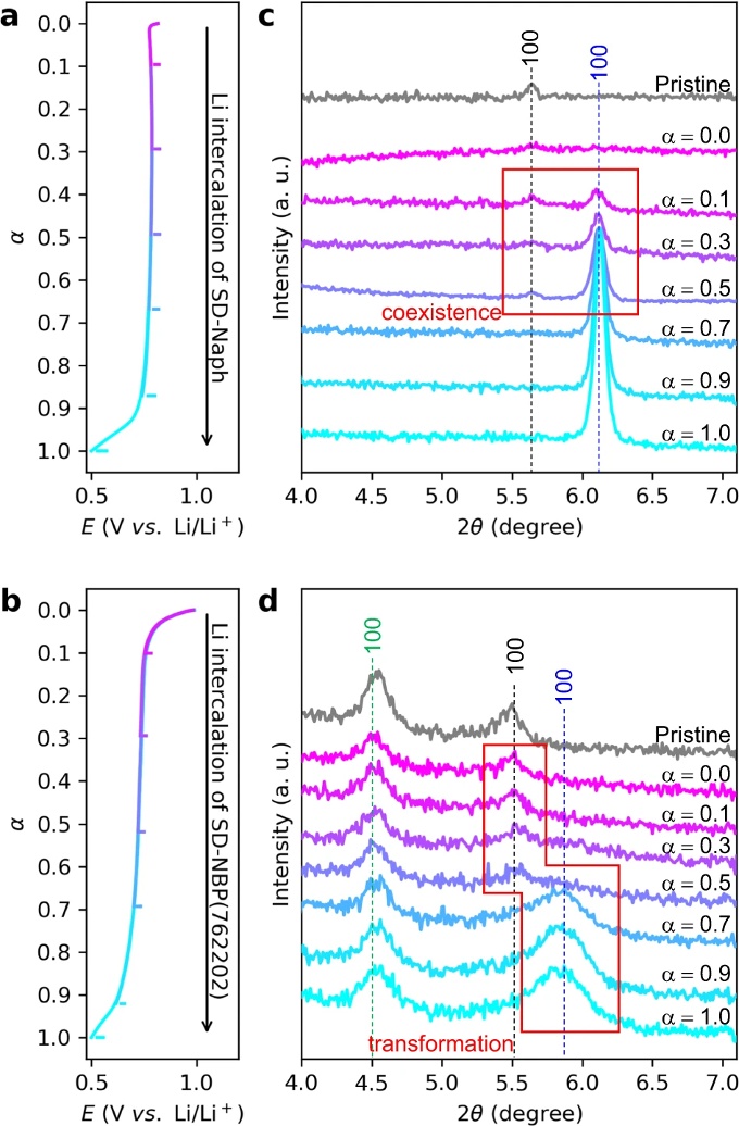 圖5.Li嵌入反應(yīng)過程中的非原位XRD圖。a,b對(duì)于用于制備非原位XRD樣品的SD-Naph(a)和SD-NBP(762202)(b),在Li嵌入過程中電位歸一化Li比例(α)的疊加曲線。c、dSD-Naph(c)和SD-NBP(762202)(d)的XRD圖與歸一化Li比率的變化關(guān)系圖。
