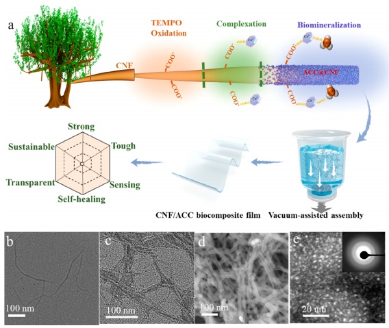上述工作近期以“Bioinspired Stabilization of Amorphous Calcium Carbonate byCarboxylated Nanocellulose Enables Mechanically Robust, Healable, and SensingBiocomposites”為題發(fā)表在ACSNano上。四川大學(xué)高分子研究所博士生鄔宛霖和福建師范大學(xué)環(huán)境科學(xué)與工程學(xué)院盧至行講師為共同一作,四川大學(xué)高分子材料工程國(guó)家重點(diǎn)實(shí)驗(yàn)室熊銳特聘研究員和德國(guó)康斯坦茨大學(xué)HelmutCölfen教授為共同通訊作者。