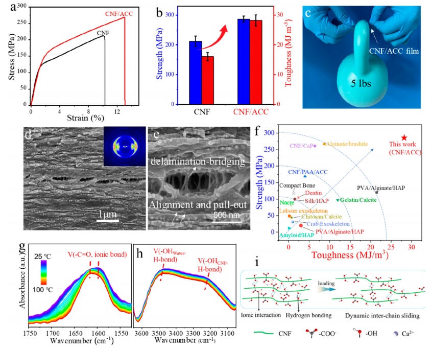 通過表面羧基和剛性分離網(wǎng)絡(luò)的協(xié)同穩(wěn)定作用,CNFs表現(xiàn)出長(zhǎng)期穩(wěn)定性(超過一個(gè)月),穩(wěn)定效率分別是羧甲基纖維素(CMC)和海藻酸鹽的3.6倍和4.4倍,甚至高于聚丙烯酸。由此產(chǎn)生的CNF/ACC分散體可以制成透明復(fù)合薄膜,強(qiáng)度高達(dá)286MPa,韌性高達(dá)28.5 MJ/m3,超過了迄今為止報(bào)道的合成生物聚合物-碳酸鈣/磷酸鹽復(fù)合材料。