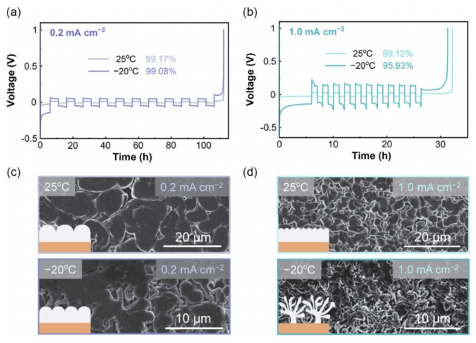 圖2LHCE電解液中不同溫度和電流密度下的鋰沉積行為,包括不同溫度下Li|Cu半電池在(a)0.2mAcm-2和(b)1.0mAcm-2電流密度下的平均庫侖效率,和不同溫度下Li|Cu半電池在(c)0.2mAcm-2和(d)1.0mAcm-2電流密度下的的沉積形貌。在(a,b)循環(huán)和(c,d)沉積中的總?cè)萘繛?.0mAhcm-2。