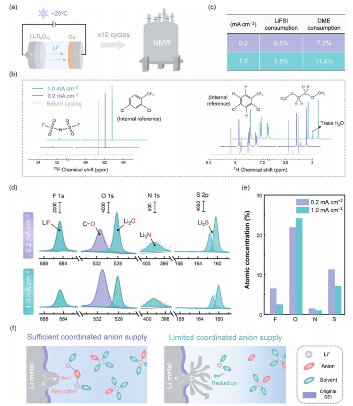 (3)通過核磁定量的探究在不用的電流密度下的電解質(zhì)中DME與FSI-的消耗,在較大的Li+濃度梯度下,Li+-陰離子相互作用減弱,不利于陰離子衍生的SEI形成。