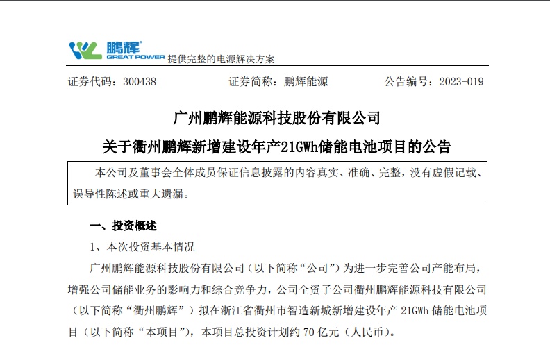 中國粉體網(wǎng)訊 4月4日,鵬輝能源公布,公司為進一步完善公司產(chǎn)能布局,增強公司儲能業(yè)務(wù)的影響力和綜合競爭力,鵬輝能源全資子公司衢州鵬輝能源科技有限公司,擬在浙江省衢州市智造新城新增建設(shè)年產(chǎn)21GWh儲能電池項目,該項目總投資計劃約70億元。該項目計劃于2023年6月底前開工建設(shè),于2026年12月底前建成投產(chǎn)。