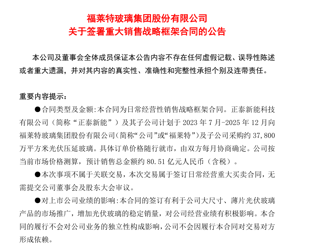 公告顯示,正泰新能科技有限公司及其子公司計劃于2023年7月-2025年12 月向福萊特玻璃集團股份有限公司及子公司采購約37,800萬平方米光伏壓延玻璃。具體訂單價格隨行就市,由雙方每月協(xié)商確定。公司按當前市場價格測算,預(yù)計銷售總金額約80.51億元人民幣(含稅)。