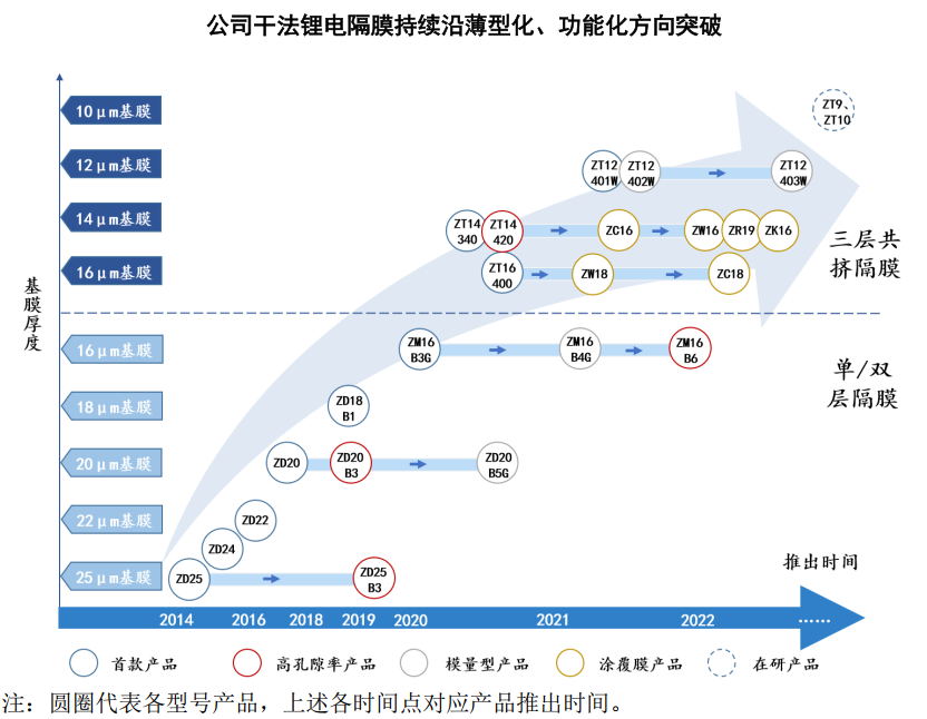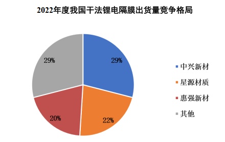 中興新材專業(yè)從事鋰離子電池隔膜等高分子特種膜材料的研發(fā)、生產(chǎn)及銷售,主要產(chǎn)品包括干法鋰電基膜及涂覆膜,目前已發(fā)展成為國內(nèi)領(lǐng)先的干法鋰電隔膜供應(yīng)商。截至2022年底,中興新材的干法鋰電隔膜年產(chǎn)能超過10億㎡,在國內(nèi)干法鋰電隔膜領(lǐng)域中具有產(chǎn)能領(lǐng)先優(yōu)勢。據(jù)統(tǒng)計,2021-2022年度,中興新材蟬聯(lián)國內(nèi)干法鋰電膈膜出貨量第一名。