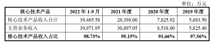 報告期內(nèi),中興新材的銷售收入呈現(xiàn)高速增長趨勢,2019年、2020年、2021年和2022年1-9月銷售收入分別為6306.46萬元、9127.99萬元、32584.47萬元和42990.04萬元,最近三年銷售收入復(fù)合增長率達(dá)127.31%。核心技術(shù)產(chǎn)品包括干法鋰電基膜及涂覆膜,各期核心技術(shù)產(chǎn)品收入占主營業(yè)務(wù)收入的比重超過90%,具體如下: