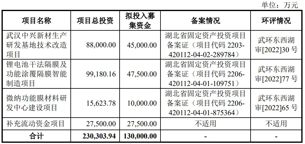 中興新材擬募集資金將投資于武漢中興新材生產(chǎn)研發(fā)基地技術(shù)改造項(xiàng)目、鋰電池干法隔膜及功能涂覆隔膜智能制造項(xiàng)目、微納功能膜材料研發(fā)中心建設(shè)項(xiàng)目以及補(bǔ)充流動資金。相關(guān)項(xiàng)目基本情況: