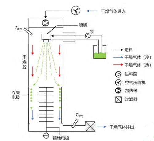 納米噴霧干燥原理與傳統(tǒng)噴霧干燥相似,但在結(jié)構(gòu)上有所差異:如圓柱形干燥室、產(chǎn)生噴霧的霧化器、在干燥氣體中誘導(dǎo)層流的多孔金屬泡沫以及靜電粒子收集器[7]。納米噴霧干燥結(jié)構(gòu)及工藝流程如下圖所示[8]。