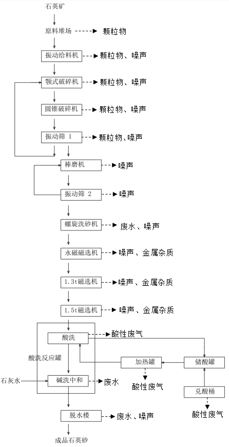(8)經(jīng)輸送進(jìn)入反應(yīng)罐進(jìn)行酸洗。開啟電加熱裝置配兌酸液加熱備用,將物料通過輸送方式進(jìn)入輸送帶,經(jīng)輸送帶將物料送入酸洗反應(yīng)罐。將配兌好的酸液經(jīng)酸泵抽入酸洗反應(yīng)罐內(nèi),酸洗進(jìn)入物料時(shí)間約一小時(shí),開啟酸循環(huán)。酸液反應(yīng)溫度控制為60~75℃(自動恒溫),開啟空壓機(jī),使物料在反應(yīng)罐中翻滾,達(dá)到物料受酸均勻目的,物料酸洗時(shí)間為4~8小時(shí)(視物料及產(chǎn)品要求而定),加熱酸洗過程中所產(chǎn)生的酸霧經(jīng)過堿水噴淋后經(jīng)酸霧凈化系統(tǒng)達(dá)標(biāo)排放。酸洗完畢酸液抽至儲酸罐儲存進(jìn)行循環(huán)使用,酸洗反應(yīng)罐內(nèi)裝有脫酸篩網(wǎng),達(dá)到酸砂分離目的,篩網(wǎng)目數(shù)根據(jù)物料要求粒度選裝。抽酸時(shí)間約1~2小時(shí)。注入清水脫洗,再注入堿水脫酸,最后注入清水洗滌。物料經(jīng)脫酸脫堿后進(jìn)入脫水樓進(jìn)行過濾,過濾后水分在13%左右輸送入庫,自然干燥兩天后水分低于5%后即可作為石英砂出廠。