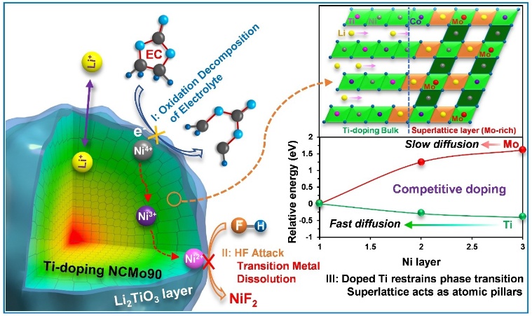 針對(duì)傳統(tǒng)體相摻雜及表界面包覆仍難以有效平衡高能量密度和高結(jié)構(gòu)穩(wěn)定性之間面臨的嚴(yán)峻挑戰(zhàn),并結(jié)合前期的研究基礎(chǔ),郭洪教授團(tuán)隊(duì)通過(guò)一步法合成策略制備出了同時(shí)包含體相鈦(Ti)摻雜、亞表面鋰/鎳(Li+/Ni2+)有序超晶格及表面包覆鋰離子導(dǎo)體(Li2TiO3)的新型LiNi0.9Co0.09Mo0.01O2高鎳三元正極材料。Ti摻雜提升材料內(nèi)部金屬-氧鍵鍵強(qiáng)和電子電導(dǎo)率的同時(shí),可增大鋰離子的遷移通道,有效提升正極材料的循環(huán)穩(wěn)定性及倍率性能。Li+/Ni2+有序超晶格層可以防止正極材料脫鋰后層狀結(jié)構(gòu)的坍塌,進(jìn)一步提升結(jié)構(gòu)的穩(wěn)定性。而表面Li2TiO3鋰離子導(dǎo)體包覆層不僅可以改善正極材料的空氣穩(wěn)定性、抑制電解液與正極活性材料之間的副反應(yīng),還可以提升鋰離子在表界面的遷移動(dòng)力學(xué)。三個(gè)方面的高效協(xié)同作用大大提升了該新型高鎳正極材料的循環(huán)穩(wěn)定性及倍率性能。