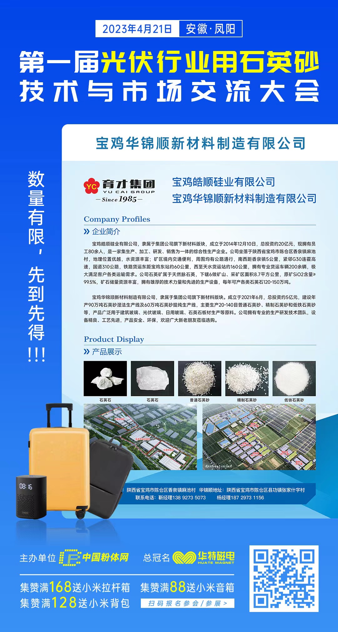 中國(guó)粉體網(wǎng)將于2023年4月21日在安徽鳳陽(yáng)舉辦“第一屆光伏行業(yè)用石英砂技術(shù)與市場(chǎng)交流大會(huì)”,寶雞皓順硅業(yè)有限公司邀您一起參加。