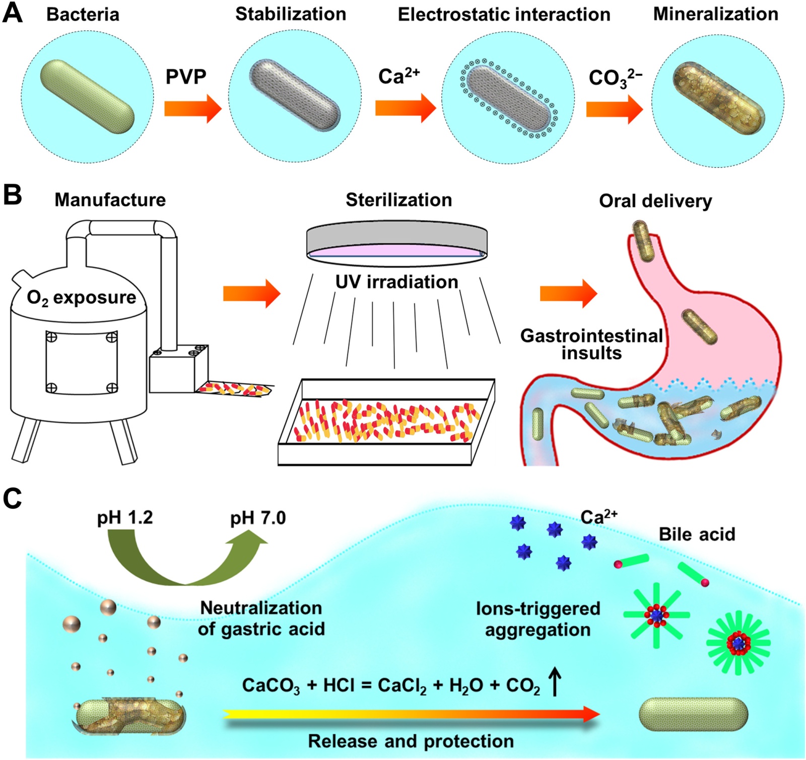 圖:生物界面礦化的示意圖,可產(chǎn)生超耐藥腸道微生物作為口服生物治療劑。(A)在細(xì)菌表面制備礦物涂層。(B)涂層細(xì)菌對環(huán)境攻擊的抵抗力。(C)胃酸的中和,包衣細(xì)菌的適應(yīng)性釋放,鈣離子 - 通過口服攝入后胃腸道中礦物涂層的雙重分解反應(yīng)觸發(fā)膽汁酸的聚集。