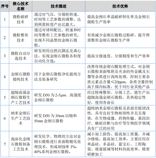 目前惠豐鉆石已研發(fā)出高端專用金剛石微粉、改性金剛石系列微粉、納米金剛石和微粒復(fù)合結(jié)構(gòu)金剛石磨粒等創(chuàng)新產(chǎn)品,且以上產(chǎn)品具備業(yè)內(nèi)可比的技術(shù)先進(jìn)性。