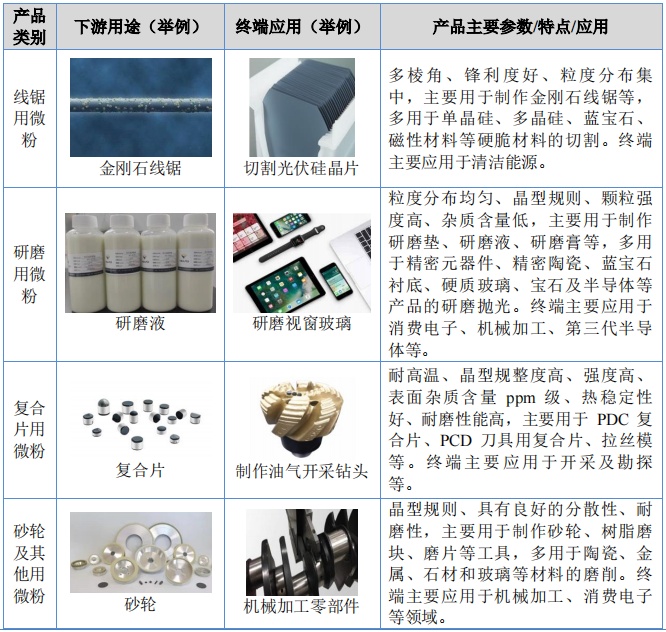 金剛石微粉的應(yīng)用主要包括兩個(gè)方面,一是利用人造金剛石超硬、耐磨、抗腐蝕的力學(xué)特性,可制作磨、削、切、割等各類金剛石工具,終端應(yīng)用領(lǐng)域于清潔能源、消費(fèi)電子、半導(dǎo)體、陶瓷石材、油氣開采、地質(zhì)鉆探、機(jī)械加工等領(lǐng)域;二是利用人造金剛石在光、電、聲、磁、熱等方面的特殊性能,作為重要的功能性材料,應(yīng)用于航空航天、國(guó)防軍工、生物醫(yī)藥等高科技領(lǐng)域。