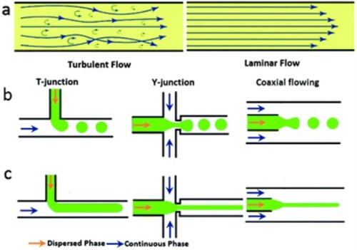 圖1:用于藥物輸送的微射流技術(shù)的基本原理。(a) 說明通道內(nèi)兩種主要流動(dòng)模式的示意圖:湍流(左)和層流(右),(b) 微射流裝置的三種基本幾何形狀示意圖。T型連接(左)、Y型連接(中)和同軸流動(dòng)(右)。