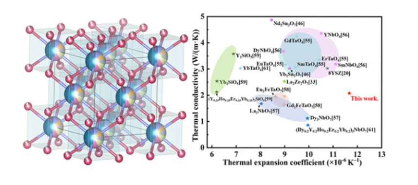 圖1.(La0.2Nd0.2Sm0.2Eu0.2Gd0.2)2Ce2O7結構示意圖和熱性能對比圖