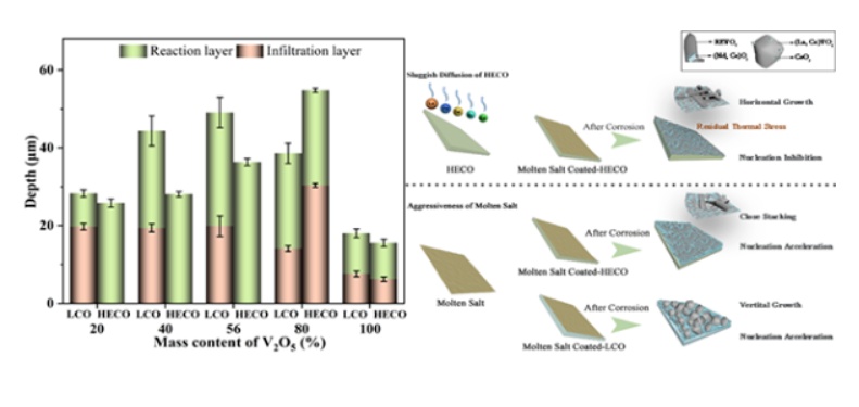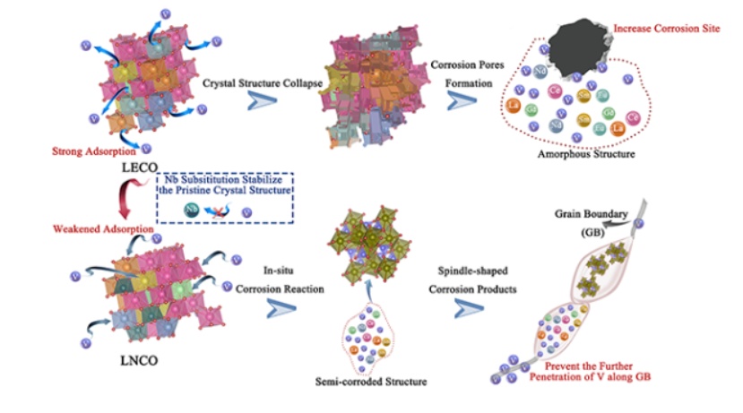 圖4.(La0.2Nd0.2Sm0.2Eu0.2Gd0.2)2Ce2O7和(La0.2Nd0.2Sm0.2Nb0.2Gd0.2)2Ce2O7高熵陶瓷的高溫熔鹽腐蝕機理示意圖