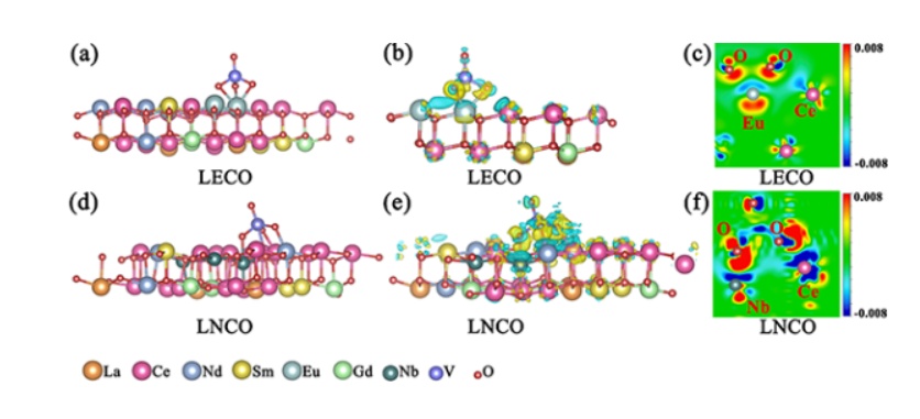 圖3.(La0.2Nd0.2Sm0.2Eu0.2Gd0.2)2Ce2O7和(La0.2Nd0.2Sm0.2Nb0.2Gd0.2)2Ce2O7高熵陶瓷與高溫熔鹽腐蝕介質吸附作用的DFT計算
