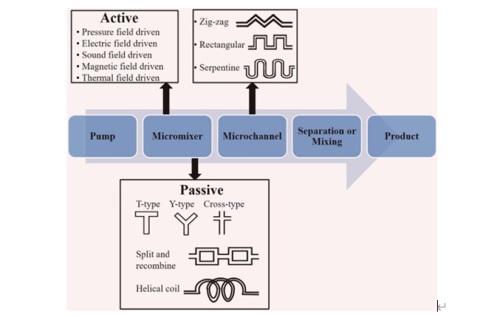 微流體系統(tǒng)的另一個(gè)重要部件是微混合區(qū),其對(duì)微流體系統(tǒng)效率和靈敏度具有顯著影響。微混合區(qū)分為混合接觸和微混合器兩個(gè)部分,混合接觸區(qū)域具有多種類型,如T型、Y型、聚焦流型以及同軸型等。而微混合器主要分為主動(dòng)型混合和被動(dòng)混合兩種,主動(dòng)型混合可以強(qiáng)混合效率,但最為常用的卻是被動(dòng)混合,被動(dòng)混合可以通過對(duì)不同的幾何形狀來產(chǎn)生不同強(qiáng)度對(duì)流,被動(dòng)型的混合效率主要靠混合結(jié)構(gòu)的形狀以及參數(shù)控制進(jìn)行調(diào)整,參數(shù)主要包括流速比以及物料組成和類型等。