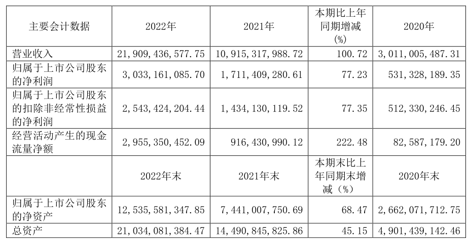 中國粉體網(wǎng)訊 近日,弘元綠能發(fā)布2022年年報和2023年一季報,2022年,公司營業(yè)收入219.09億元,同比增長100.72%;歸屬于上市公司股東的凈利潤30.33億元,同比增長77.23%。對于公司營業(yè)收入增長的原因,弘元綠能表示是公司單晶硅業(yè)務規(guī)模擴大所致。