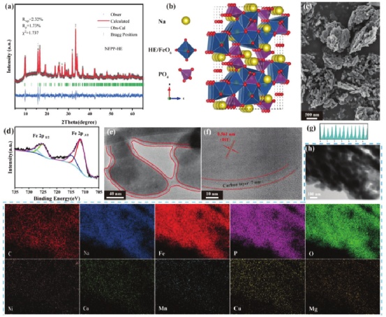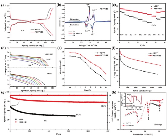 圖2:a) 0.1C下的充放電曲線;b) NFP-HE在0.1 mV s−1下的循環(huán)伏安圖;c) 倍率性能;d) 不同倍率下的放電曲線;e) 不同C-率下的放電平均電壓;f) 功率密度-能量密度;g) 10C下的循環(huán)性能;和h)Na+離子的化學擴散系數(shù)。