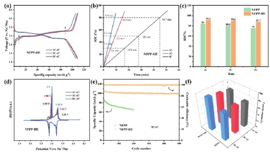 圖3:a) 不同充電速率和固定放電速率下的充放電曲線;b) SOC——NFPP-HE的時間;c) SOC—速率圖;d) NFPP-HE的dQ/dV圖;e) 在5C–1C下的快速充電循環(huán)性能;以及f)在不同充電速率下的容量保持。