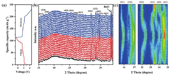 圖4:a) 0.1C下的充放電曲線。b)原位XRD圖譜和c)相應的等高線圖。
