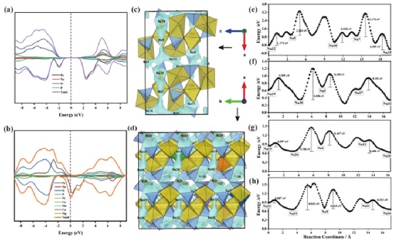 圖5:a)NFPP和b)NFPP-HE的態(tài)密度(DOS)。c)NFPP和d)NFPP-HE的鍵價能量景觀(BVEL)和Na+遷移途徑。e)NFPP和f–h)NFPP-HE的相應Na+遷移能壘。