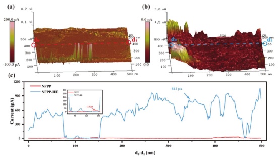 圖6:在ITO玻璃基板(500×500nm2)上獨立收集的a)NFPP和b)NFPP-HE電極的電流圖。c) c-AFM電流d0–d1,沿x軸選擇從(a)到(b)的虛線。