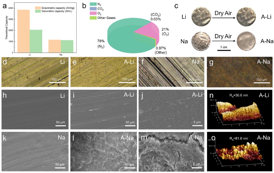 隨著人們對電子設備的需求日益增加,石墨等經(jīng)典電極將無法滿足電池能量密度方面的高要求。鋰金屬是在陽極側(cè)實現(xiàn)高能量密度的解決方案之一(圖1a)。雖然鋰金屬在潮濕的空氣中高度不穩(wěn)定,而其在干燥的環(huán)境中具有相對較高的空氣穩(wěn)定性,這使得大規(guī)模制造鋰金屬電池成為了可能。與此同時,金屬鈉也是一種具有高能量密度的陽極,可用于電網(wǎng)存儲的鈉基電池;然而,即使是在干燥的空氣中,鈉也是不穩(wěn)定的,這一特性阻礙了其進一步的應用。就動力學而言,在干燥的空氣中,Li是穩(wěn)定的,而Na是不穩(wěn)定的,這一現(xiàn)象尚未被人們完全理解。在生產(chǎn)和運輸過程中,Li或Na與環(huán)境氣體之間的接觸初步構(gòu)成了固體電解質(zhì)界面(SEI),從而為電池系統(tǒng)中隨后的電化學和化學腐蝕反應設定了初始條件。因此,迫切需要從堿金屬陽極電池的安全性和穩(wěn)定性的角度來闡明堿金屬在干燥空氣中的界面鈍化化學。