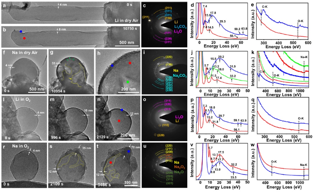 圖2. 在干燥空氣或O2中Li和Na表面層形成過程的納米級原位ETEM研究。