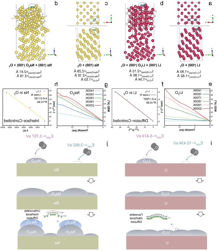 作者通過吉布斯自由能的計算,發(fā)現(xiàn)在熱力學的角度,由Na2O形成Na2O2比由Li2O形成Li2O2更有利。為了解釋整個現(xiàn)象,作者通過密度泛函理論(DFT)計算研究了O2在M(Li或Na)和M2O上的初始吸附機制。能量最低的最穩(wěn)定配置如圖3a–d所示。計算表明,O2會在Na2O上快速吸附,而在Na上進行相對緩慢的吸附。O2在Na表面上的吸附經(jīng)歷了一個非離解過程,這表明其吸附能略高于在Na2O上的吸附能。因此,當O2攻擊時,Li是Li/Li2O界面中的優(yōu)先吸附基質(zhì),但根據(jù)計算,這種優(yōu)先級在Na系統(tǒng)中不太清楚(O2對Na2O甚至可能在動力學上更有利)。接著,作者通過進一步的動力學計算,提出了Li和Na與氧的特定反應機制(圖3i,j)。在Li–O2體系中,O2在缺陷等活性位點上發(fā)生初始吸附后,立即形成Li2O。隨后的O2吸附仍然優(yōu)先發(fā)生在新鮮的Li位點,而不是在Li2O上,導致Li2O的產(chǎn)物呈現(xiàn)為完整且緊湊的覆蓋堆疊,該過程一直持續(xù)到不再存在新鮮的Li。該體系中的低擴散速率防止了通過傳質(zhì)形成厚的Li2O,并且單一產(chǎn)物(Li2O)也誘導了均勻的Li擴散通量。而在Na–O2系統(tǒng)的情況下,O2在Na和Na2O上的吸附具有相似的概率,導致不同Na2O島之間的初始尺寸分布相對較大。小的Na2O島傾向于擴散并合并成大島,以減少表面能。同時,基于Na2O的Na2O2的形成可以進一步增厚鈍化層,并且通過Na2O/Na2O2存在不利的界面擴散,導致Na2O/Na2O2生長不均勻(不足的Na離子傾向于優(yōu)先聚集在尖端,這類似于金屬的枝晶生長機制)。在進一步暴露于CO2時,Li系統(tǒng)在先前均勻且薄的Li2O的基礎上產(chǎn)生均勻的Li2CO3,這使得大塊Li在干燥空氣中穩(wěn)定且有光澤。相反,Na上的鈍化層是粗糙和多孔的,因為首先形成Na2O/Na2O2層,然后形成Na2CO3,其中Na2O2和CO2反應產(chǎn)生的新O2可能逸出,導致許多空隙和孔,這些空隙和孔可能由于Kirkendall效應而破裂。因此,具有許多裂紋的多孔鈍化層會導致干燥空氣中Na的快速失效。盡管Li+的移動速度也比O2-快,但在Li系統(tǒng)中沒有Kirkendall擴散,因為Li2O的薄而緊湊的覆蓋層可以保護Li金屬不與氧氣發(fā)生過多反應。