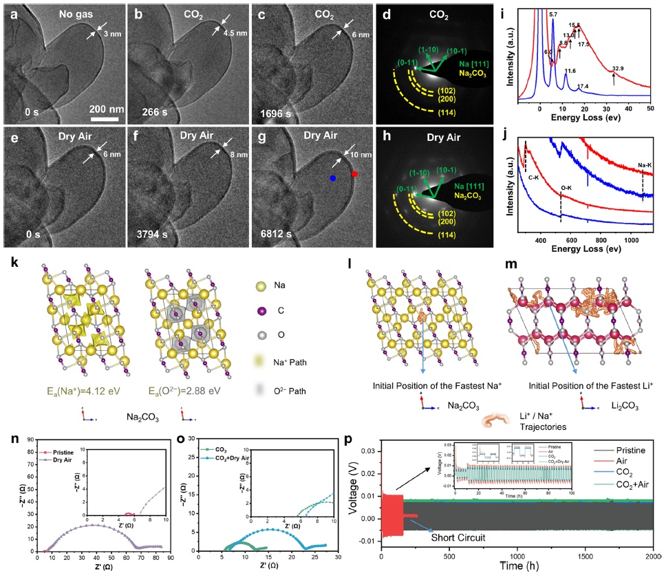 預設碳酸鹽鈍化層來實現(xiàn)Na的防腐為了使Na在干燥空氣中保持穩(wěn)定,可在氧化過程之前引入保護層。為此,作者采用CO2處理以產(chǎn)生均勻的Na2CO3層。當CO2與新鮮Na接觸時,逐漸形成結(jié)晶度均勻且厚度很薄的鈍化層(圖4a–d)。隨后,將氣體環(huán)境從二氧化碳轉(zhuǎn)換為干燥空氣。研究發(fā)現(xiàn),干燥的空氣不能破壞Na2CO3覆蓋的Na顆粒,在沒有其他成分的情況下,膜厚度緩慢穩(wěn)定地增長到10 nm(圖4e–h,j)。此外,在第二步中用O2代替干燥空氣時,緊湊型Na2CO3甚至可以保護Na免受O2的侵蝕。為了解釋這一現(xiàn)象,作者通過BV方法證實Na+在Na2CO3中的遷移勢壘高于O2-(圖4k),這導致Na+的緩慢擴散,并限制了Na2CO3的進一步生長。
