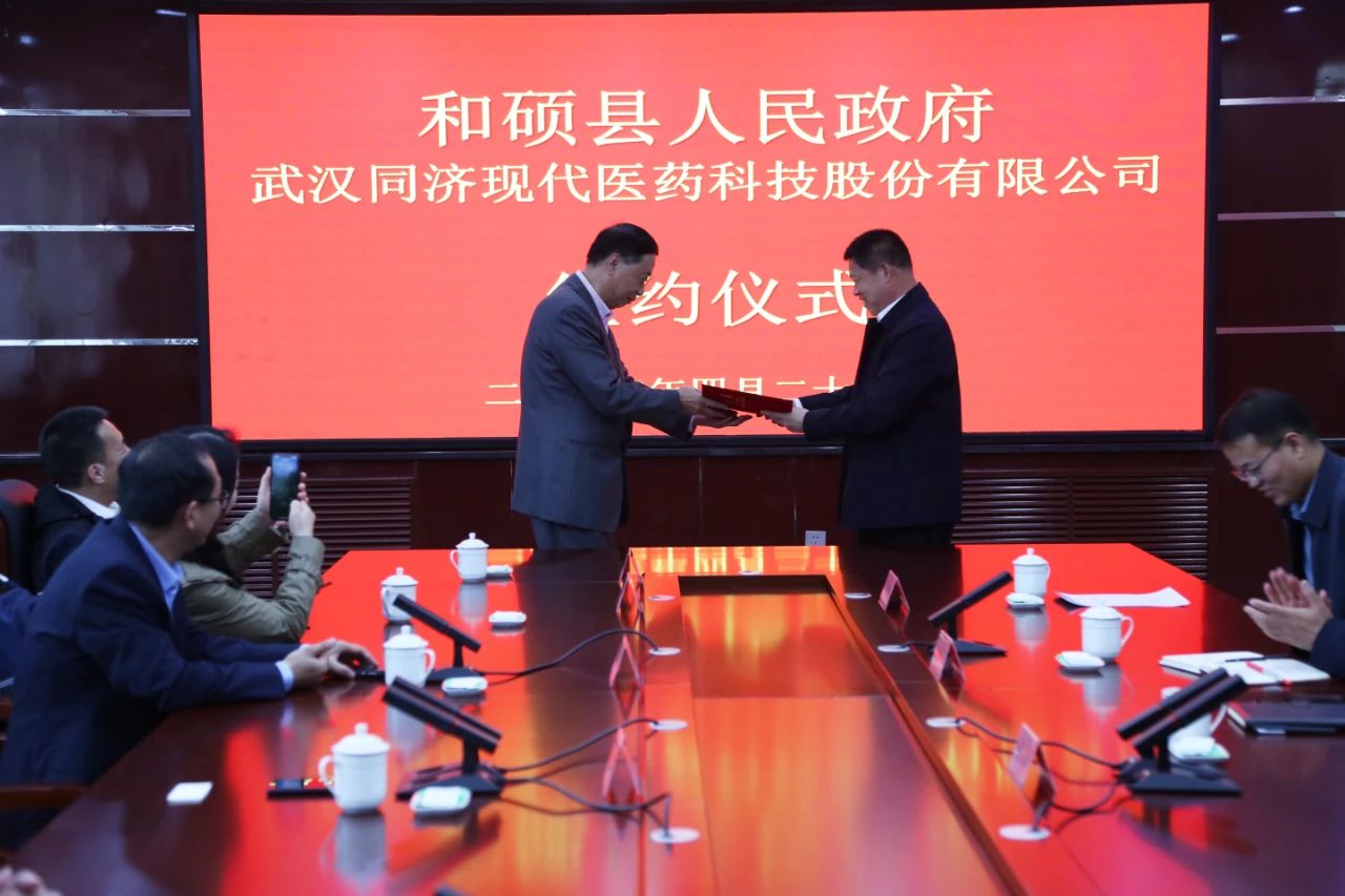和碩縣委書記朱軍,原中國無機鹽工業(yè)協(xié)會碳酸鈣行業(yè)分會會長、專家組組長劉樹文,武漢同濟現(xiàn)代醫(yī)藥有限公司董事長李亦武見證簽約并講話。和碩縣委副書記、常務副縣長朱宏偉與武漢同濟現(xiàn)代醫(yī)藥有限公司董事長李亦武簽訂戰(zhàn)略合作意向書。