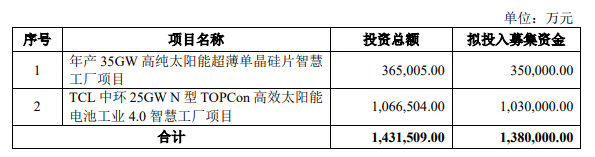 中國粉體網(wǎng)訊 5月29日,TCL中環(huán)發(fā)布公告,擬向不特定對象發(fā)行可轉換公司債券,本次可轉債發(fā)行總額不超過人民幣1,380,000萬元(含1,380,000萬元),扣除發(fā)行費用后將全部用于以下項目: