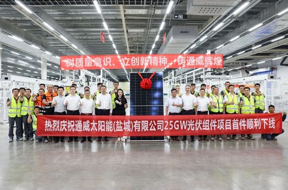 中國粉體網(wǎng)訊 近日,通威太陽能(鹽城)有限公司25GW光伏組件項目首件組件順利下線。