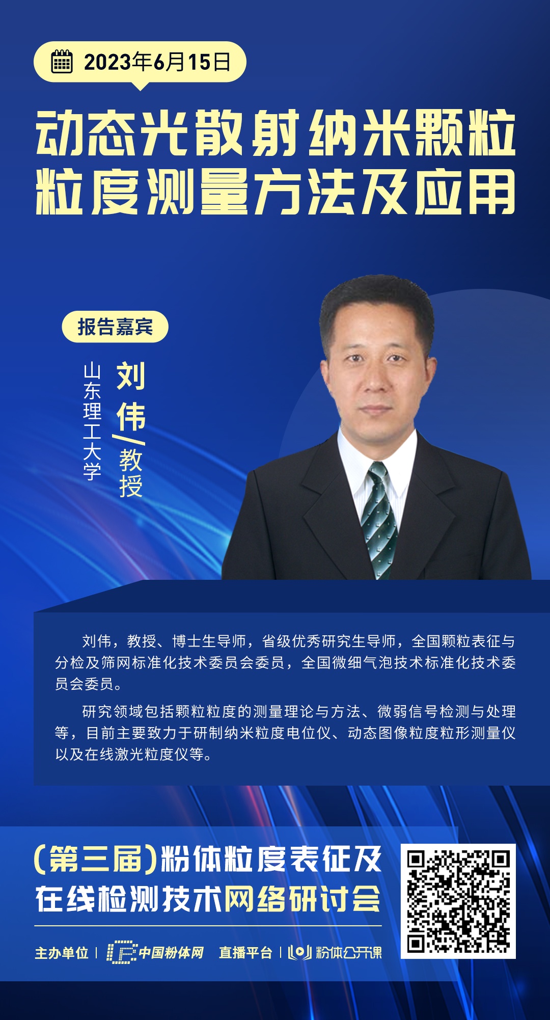 此次直播特邀山東理工大學(xué)劉偉教授做報(bào)告:動(dòng)態(tài)光散射納米顆粒粒度測量方法及應(yīng)用