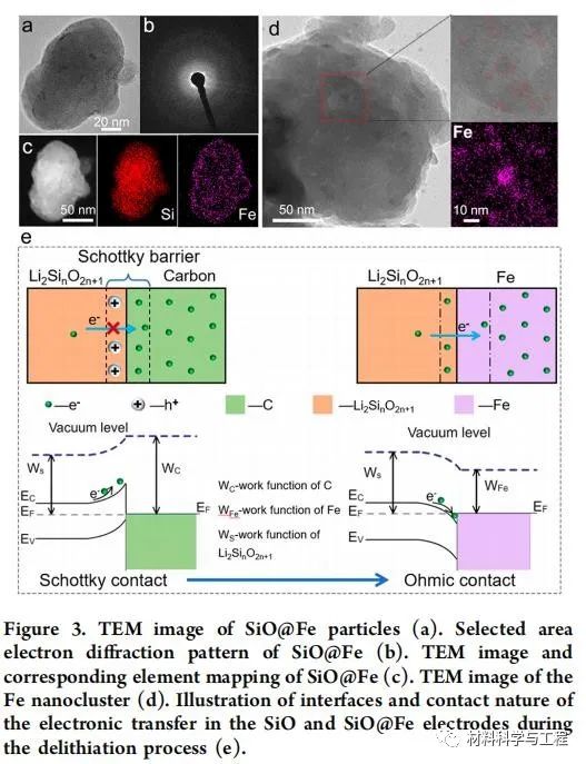 在此,作者報告了一種顯著提高SiO負(fù)極首次庫侖效率的方法,通過CVD工藝在SiO表面包覆一層均勻的Fe納米團簇,形成的核/殼結(jié)構(gòu)能解決SiO的首次庫侖效率問題;诰哂袣W姆接觸和電子隧道效應(yīng)的界面設(shè)計,分散良好的Fe納米團簇可以激活初始鋰化過程中產(chǎn)生的Li2SinO2n+1的脫鋰反應(yīng),并使鋰離子能夠在脫鋰過程中從硅酸鹽中釋放,從而提高SiO電極的首次庫侖效率。相比原始SiO64.4%的初始庫倫效率,通過3.3%的Fe納米團簇包覆,SiO@Fe負(fù)極材料實現(xiàn)了87.2%的高首效,約提高23%,優(yōu)于最近關(guān)于SiO負(fù)極的最佳報道(除了預(yù)鋰化),同時,F(xiàn)e納米團簇包覆顯著提高了SiO電極的倍率性能和循環(huán)穩(wěn)定性。這項工作提供了一種有效的方法來解決由于惰性鋰化產(chǎn)物的形成而導(dǎo)致的SiO電極的低首效問題。(文:李澍)