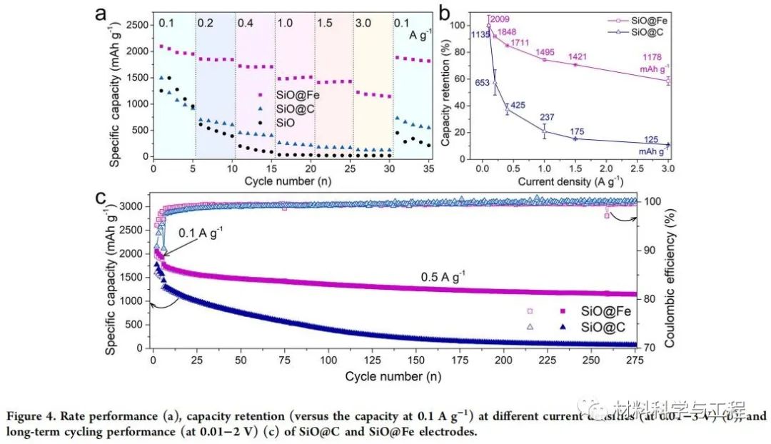 圖4SiO@C和SiO@Fe電極的倍率性能和長循環(huán)性能