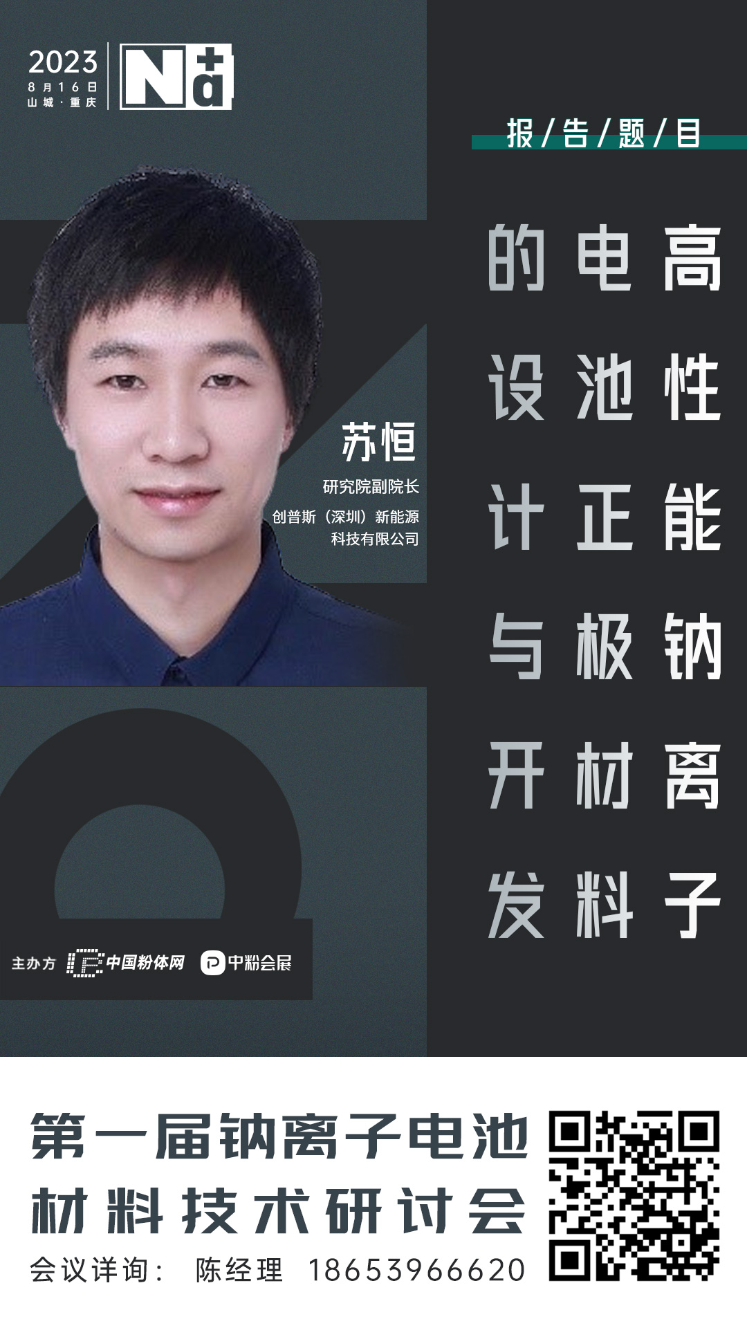 2023年8月,中國粉體網(wǎng)將在山城重慶舉辦“2023先進(jìn)正極材料技術(shù)與產(chǎn)業(yè)高峰論壇暨第一屆鈉離子電池材料技術(shù)研討會(huì)”。我們有幸邀請(qǐng)到創(chuàng)普斯(深圳)新能源科技有限公司鈉電研究院的蘇恒副院長為我們帶來題為《高性能鈉離子電池正極材料的設(shè)計(jì)與開發(fā)》的報(bào)告。